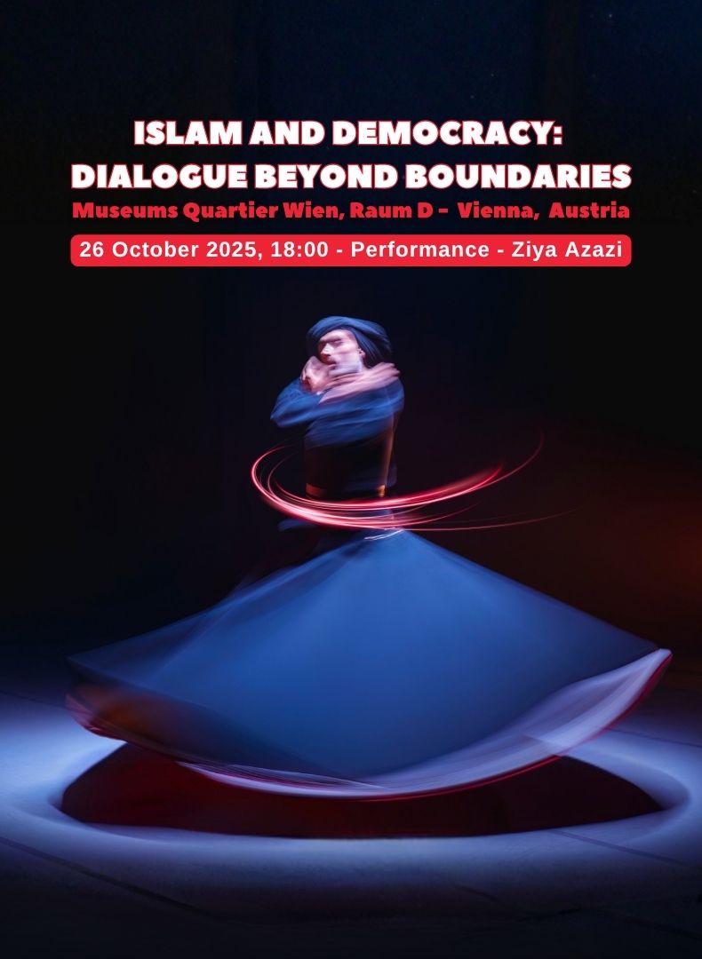 Performance by **Ziya Azazi** — internationally acclaimed artist, choreographer, and founder of *Dervish in Progress*. Born in Antioch/Hatay and living in Vienna, Azazi is one of the most recognized contemporary Sufi dancers in Europe. His art combines the ancient Sufi whirling tradition with modern aesthetics and digital creativity, bridging cultures and emotions. Through his performance, both the dancer and the audience experience an altered state of perception, touching the fine line between emotion, release, and transcendence. The performance opens this evening’s dialogue on ‘Political Islam vs. Democracy’ by inviting reflection beyond ideology — into shared humanity, presence, and awareness.